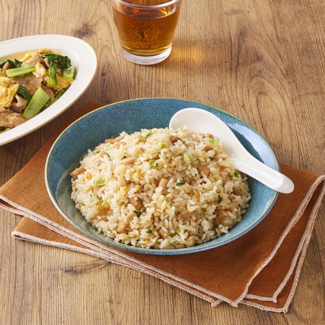 甘酒を加えた醤油だれで漬け込んだ生協の産直「神山鶏」のチャーシュー、卵と野菜(にんじん・ねぎ)を具材に彩りよく仕上げたパラリとした食感のチャーハンです。