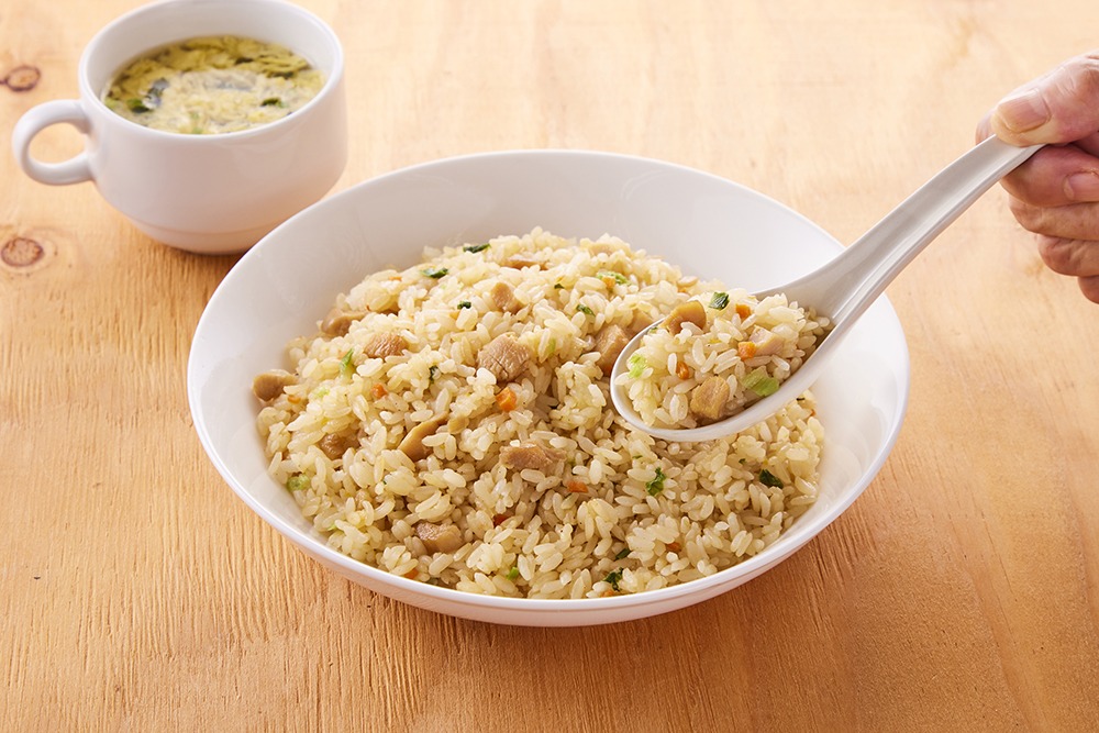 ふわふわの卵、野菜(にんじん・ねぎ)ももちろん国産。炒め油は「自然派Style一番搾り純正なたね油」、味付けには、「自然派Style特選丸大豆醤油「豊穣の恵」」を使っただし醤油をベースに、ポーククエキスと白こしょうを加えて整えました。