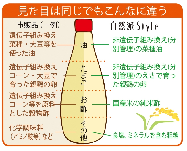 自然派Style一番搾り純正なたね油や遺伝子組み換え混入防止管理済のえさで育てた鶏卵の他に使用したのは、国産純米酢、まろやかな塩味の平釜塩「海はいのち」、種子島産粗糖だけ。市販の多くのマヨネーズに使用される化学調味料を使わず、質のいい素材それぞれのおいしさとコクを活かしたバランスのいい仕上がりです。